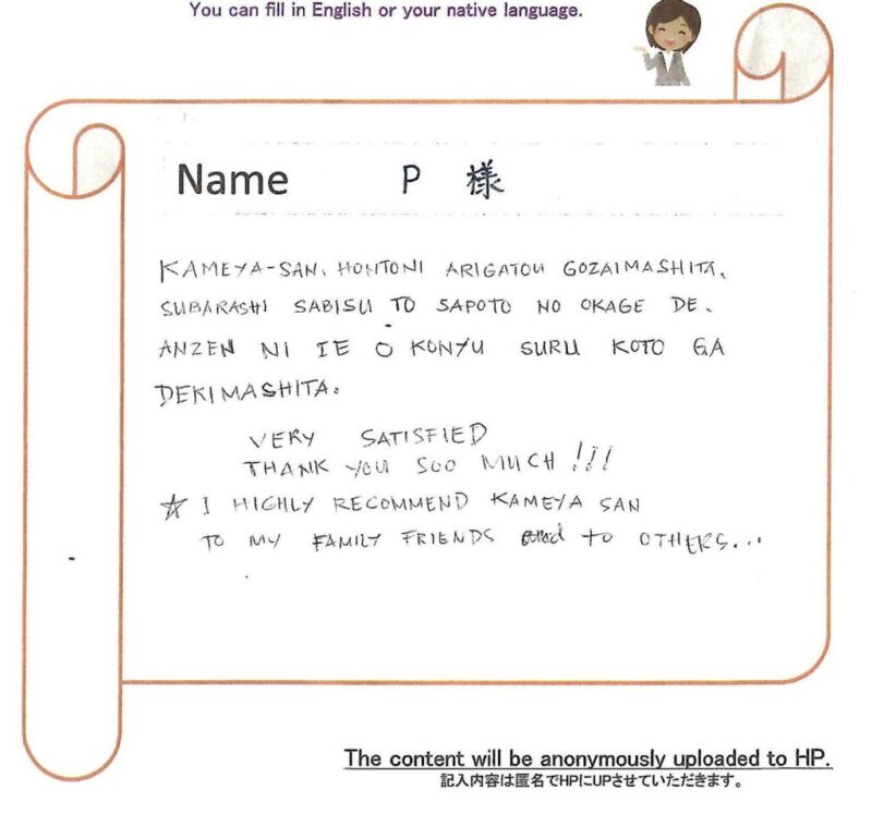 カメヤ不動産本当にありがとうございました。 素晴らしいサービスとサポートのお陰で安全に 家を購入することができました。 とても感謝しています。 家族や友人にもカメヤ不動産を紹介したいです。