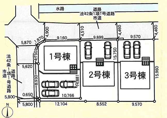 北側 約4.46~4.9mの道路に約9.89m接する |