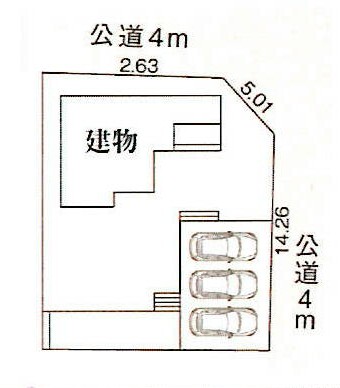 北側 約4mの道路に約7.64m接する 東側 約4mの道路に約14.26m接する |